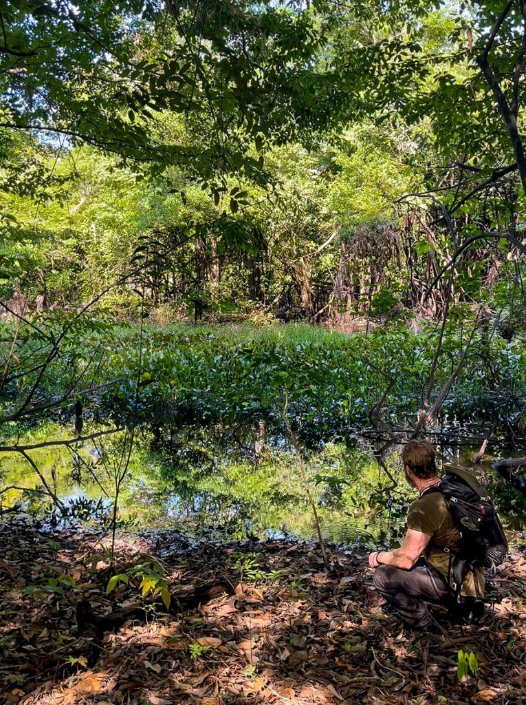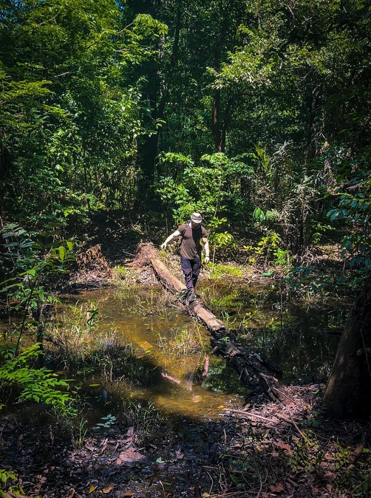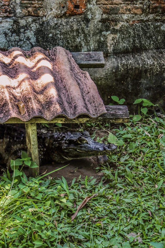In jedem Winkel des grünen Dickichts überraschte mich etwas Unerwartetes. Fingerkuppengroße Frösche kreuzten springend meinen Pfad, eine Armee von Ameisen überfiel einen herabgestürzten Bienenstock, orangefarbene Äste wuchsen aus dem Stamm eines Baumriesen. Ich kletterte über faszinierende Wurzelwerke, wich unzähligen vom Himmel herabhängenden Luftwurzeln aus. Mein Blick viel auf einen Tümpel zu meiner Linken. Ein vermeintliches Treibholz entpuppte sich als ausgewachsener Kaiman, der sich lauernd durch das Gewässer treiben ließ.