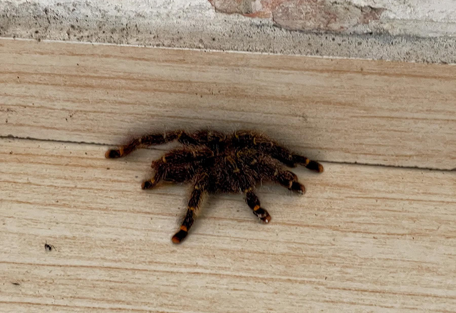 Im Innenhof beäugte mich ein ausgewachsener Kaiman, der unter einem Sonnendach entspannte. Auch in der Küche gab es eine tierische Überraschung. Hinter der Eingangstür lauerte eine handtellergroße Tarantel.