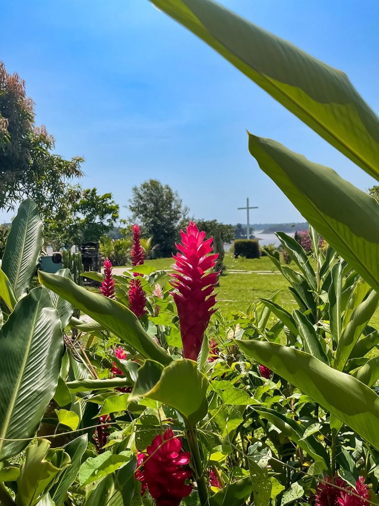 Nach gezählten 91 Stufen gelangten wir auf eine große, gepflegte Grünfläche. Direkt vor uns thronte das schlichte, gut sechs Meter hohe Kreuz, montiert auf einem stabilen Steinsockel. Dahinter gedieh ein farbenfroher, prächtiger Garten, der uns zum Kloster der historischen Missionsstation führte. Wir traten ein und durften uns frei umschauen.