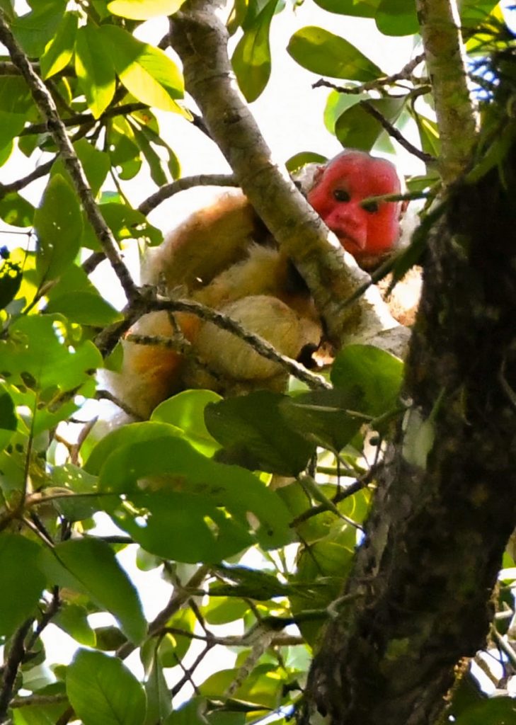 Behutsam versuchte ich jedes noch so kleine Detail wahrzunehmen. Immer wieder legte ich spontan meinen Kopf in den Nacken, schaute in die Höhe und staunte. Prächtige, rot-blaue Aras ruhten im Geäst und schmückten das intensive Grün des Dschungels wie Kristallkugeln den Weihnachtsbaum. Nur unweit davon sprangen Totenkopfäffchen flink wie Eichhörnchen durch die Lüfte. Während ein Specht wild und energisch auf einen Baum einhämmerte, hing ein gemütliches Faultier nur wenige Meter daneben und ließ sich nicht aus der Ruhe bringen. Mehrere Leguane klammerten sich an einen Baumriesen direkt gegenüber und schienen das Szenario ebenso aufmerksam zu beobachten, wie ich es tat. Dabei hatte ich das Außergewöhnlichste noch gar nicht gesehen. Denn meine eigentliche Mission für den heutigen Tag hieß: einen seltenen Roten Uakari hoch oben in den Baumkronen sichten…