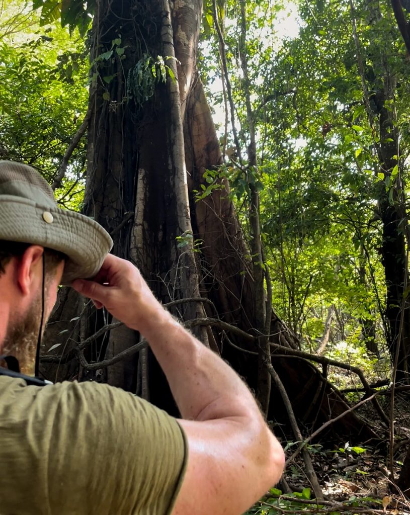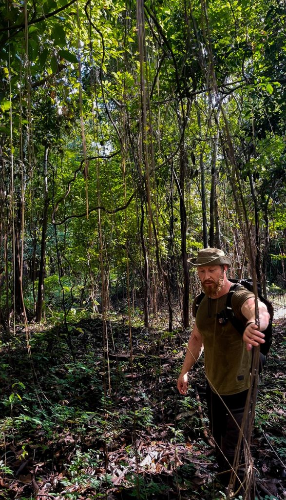 Mittlerweile hatte die eine oder andere Mücke ihren Stechrüssel treffsicher in meiner Haut platziert. Aber der wertvolle Tipp eines Guides sorgte für Abhilfe. Er empfahl mir, meine Hand auf ein Termitennest zu legen. Sofort wuselten unzählige der kleinen Krabbeltiere über meine Finger. Diese, so der Guide, solle ich schnellstens zwischen meinen Händen verreiben. Augenblicklich entstand ein angenehmer, fast schon betörender Duft. Fortan reduzierten sich die Mückenangriffe merklich. Ich stolperte über Kletterpflanzen, versank knietief im Morast, balancierte über Baustämme und war obendrein darauf bedacht, keine lauten Geräusche zu verursachen. Mit Argusaugen suchte ich pausenlos die Umgebung ab – vom überwucherten Boden bis zum imposanten Dschungeldach.