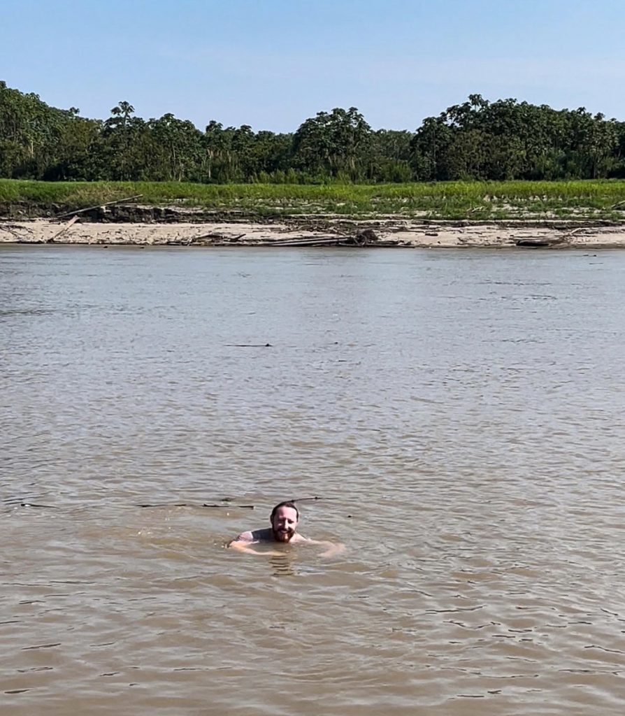 Wir hielten an einem scheinbar ruhigen Bereich des Stroms. Die Crew und Mitreisenden waren teils amüsiert, teils besorgt über mein Vorhaben. Niemand war erpicht, es mir gleich zu tun – ich jedoch konnte es kaum erwarten. Die Schwimmweste kurzerhand zweckentfremdet und um die Hüfte gebunden, kletterte ich über das Geländer und sprang. Ich tauchte ein in das herrliche, überraschend warme Wasser, glitt in die unbekannte Tiefe herab und öffnete schließlich die Augen. Ein undurchsichtiges Braun raubte mir jegliche Sicht. Wieder an der Wasseroberfläche nahm ich mir Zeit, den Moment intensiv wahrzunehmen und ließ mich treiben. Unentwegt wuselte es um meine Hüfte, Beine und Füße, doch eben dies gehörte zu dem aufregenden Erlebnis dazu.
