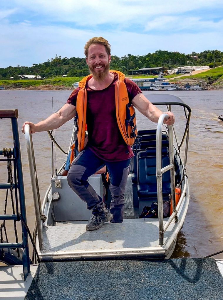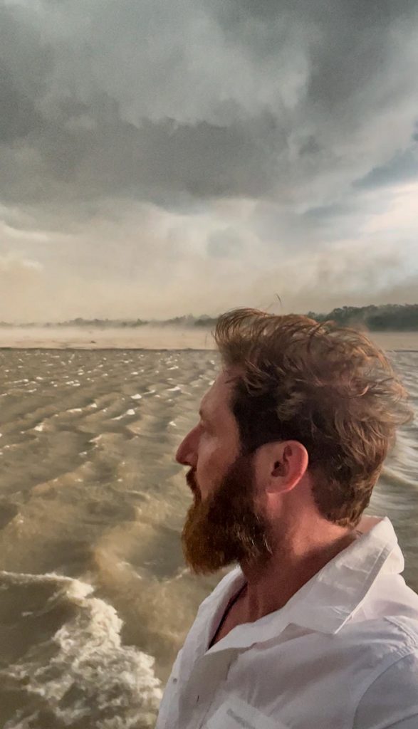 Doch der Wind legte noch deutlich zu, nahm gar stürmische Ausmaße an. In der Ferne beobachtete ich eine kilometerlange Sandbank in ungeahnte Höhen aufwirbeln. Gewitterwolken, sprühendes Flusswasser und Sandsturm: Alles vermischte sich zu einem atemberaubenden Gesamtkunstwerk. Irgendwo dazwischen lugte die rote Sonnenglut der Abenddämmerung hindurch, bis sie im tosenden Amazonasbecken versank. In stockfinsterer Dunkelheit sah man noch Stunden später grelle Blitze den Himmel erhellen, der Fluss jedoch hatte sich schon längst wieder beruhigt. Im gesamten Regenwaldgebiet herrschen konstant unzählige Gewitter. Eines davon erlebte ich an diesem Abend hautnah. Im Nachhinein erfuhr ich von einem Schiff, das an eben diesem Tag unweit von uns gekentert war. Glücklicherweise hatte sich die Besatzung an Land retten können. Das Wetter entlang des größten Flusses der Erde ist unberechenbar. Doch ohne Regen kein Regenwald und ohne Regenwald kein Leben.