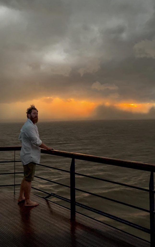 Stürmische Böen ließen das Boot in alle Richtungen schwanken. Die eben noch ruhige Wasseroberfläche verwandelte sich in tausende kleinste Windwellen, die meine Blicke beinah hypnotisch auf sich zogen. Starkregen prasselte auf das Verdeck, so ohrenbetäubend, dass ich die Worte des Guides, der etwas zu mir rüber brüllte, nicht verstand. Flusswasser preschte von allen Seiten ans und ins Boot. Die Wetterküche des Amazonas brodelte. Wir entschieden uns, zügig zum Schiff zurückzukehren. Völlig durchnässt aber wohlbehalten wieder an Bord, begann das Unwetter erst richtig zu wüten. Ich lief einige Runden über das Deck und beobachte das intensive Naturspektakel. Aufgrund seiner zwei Gleitrümpfe verdrängte der Katamaran das Wasser des aufgewühlten Flusses effektiv und bot uns eine möglichst sichere Fahrt. Dennoch war dem Kapitän eine gewisse Anspannung anzumerken. So plötzlich der Regen gekommen war, so schnell ließ er auch wieder nach.