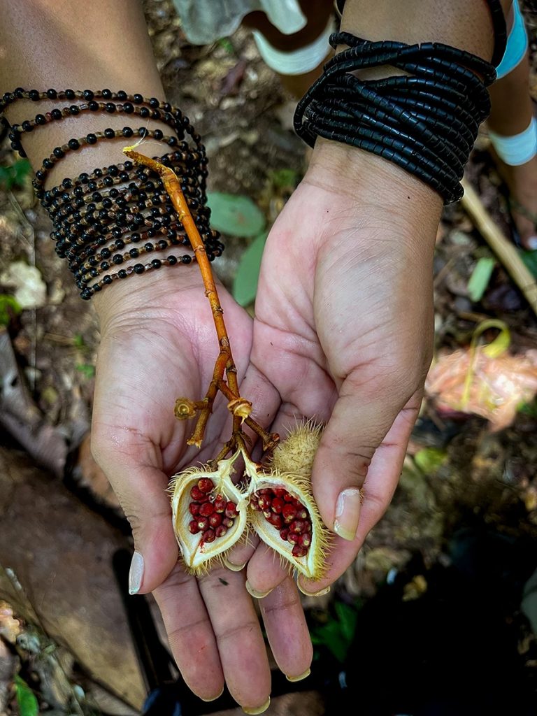 Eine der Eingeborenen pflückte eine kastanienähnliche Frucht von einem Strauch, der im Dschungel allerorts wuchs. Sie zerdrückte die innenliegenden, rotgelben Samen mit ihren Fingerspitzen. Sogleich entstand eine kräftige orangefarbige Paste, mit der sie ihr Gesicht und meines verzierte. Urucum nennen die Brasilianer die Pflanze, die im tropischen Regenwald gedeiht und von indigenen Völkern wie den Matis genutzt wird. Als kosmetisches Präparat wird sie bei Zeremonien oder Kriegsritualen eingesetzt. Zudem dient sie traditionell als Sonnen- und Insektenschutz, Aphrodisiakum und Leber-Tonikum.