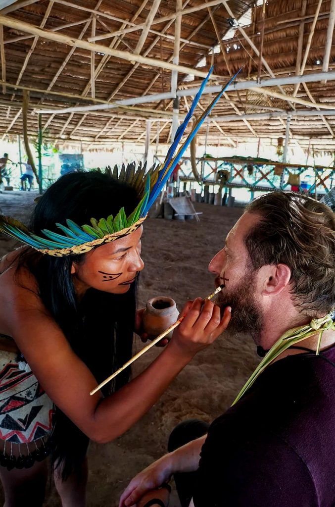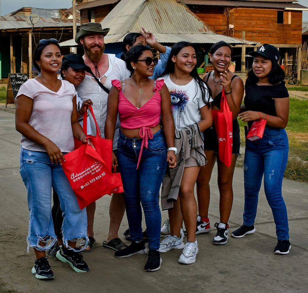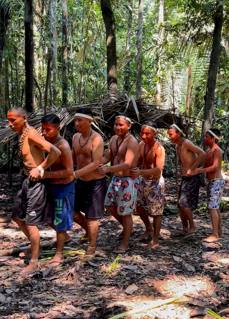 Eine Schar von Dorfbewohnerinnen, allesamt traditionell gekleidet, umschloss uns freundschaftlich. Ich wurde mit einer Kette aus Schilf und Gräsern behangen und herzlich willkommen geheißen. Den sozialen Mittelpunkt des Dorfes bildeten ein Gemeindehaus, die sogenannte Maloca, sowie der weitläufige Platz drumherum. Die ganze Dorfgemeinschaft war wohl eingetroffen, denn nur sehr selten befahren Reisende diesen Bereich des amazonischen Oberlaufs. Ich mischte mich unter das Volk.