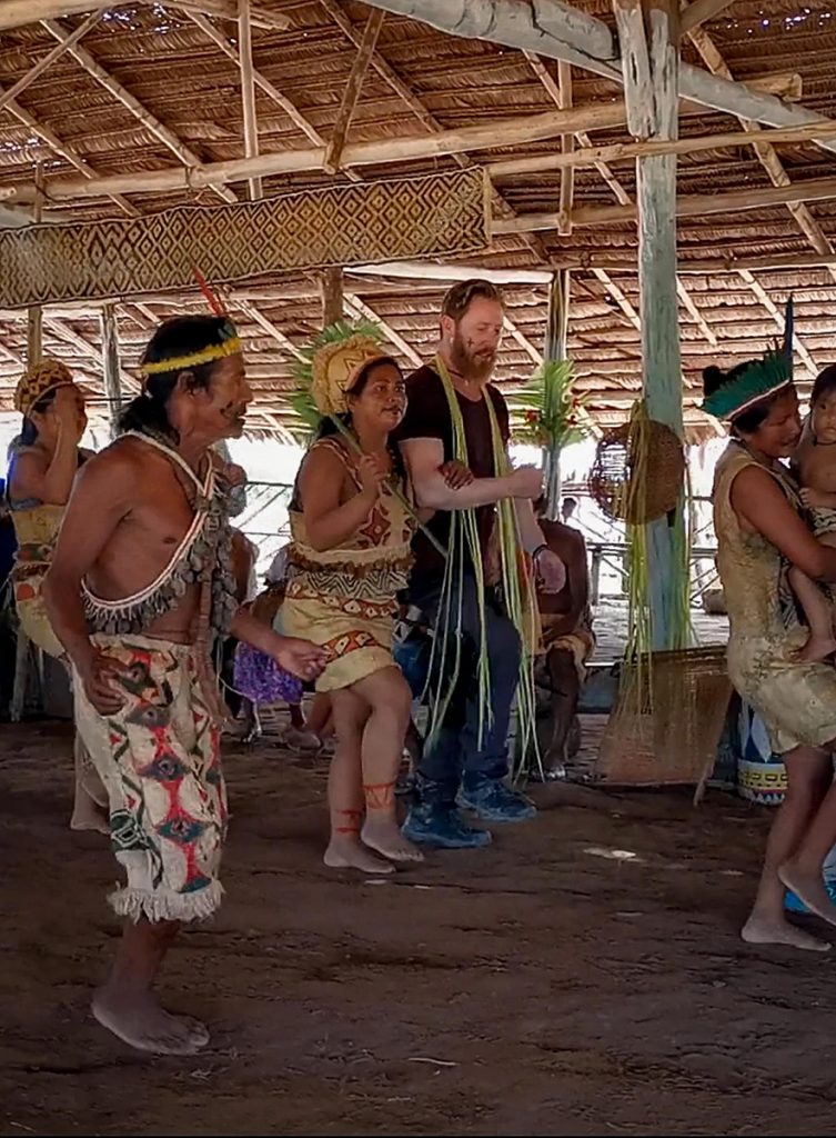 In der Mitte des geräumigen Langhauses versammelte sich eine Gruppe aus 16 weiblichen Ticuna unterschiedlichen Alters und brachte sich in Position. Ein Stammesältester gab den Takt vor. Nun begann, uns zur Demonstration, eine Auswahl beeindruckender Ritualtänze, die stets zu bedeutsamen Anlässen vollführt werden. Plötzlich griff eine der Damen nach meiner Hand. Ich wurde kurz in den Tanz eingewiesen, dann bewegte ich mich auch schon zum Klang ihres Gesangs und ließ mich tragen vom stetigen Rhythmus der Trommeln und Rasseln…