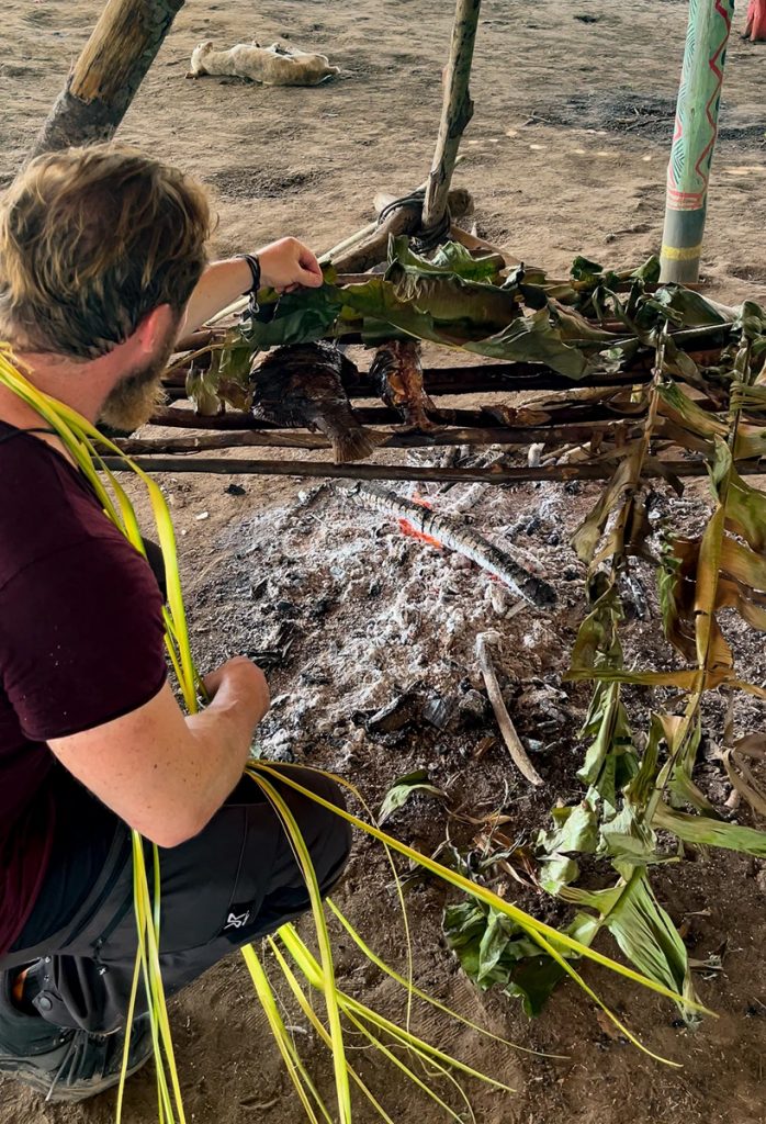 Die Neugier und das Interesse beruhten auf Gegenseitigkeit und so beäugte man sich respektvoll und lächelnd. Nach einer Weile wurden wir in die Maloca gebeten. Ich nahm Platz auf einem Holzschemel in unmittelbarer Nähe zu einer offenen Feuerstelle, auf der frisch gefangener Fisch gegrillt wurde. Mit einem Palmenwedel entfachte eine Einheimische die Glut.