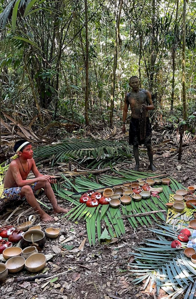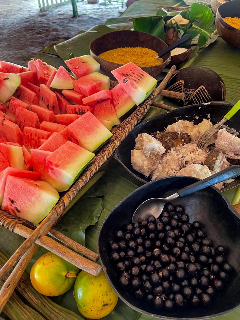 Ein appetitlicher Duft durchzog die Maloca. Einige Dorfbewohnerinnen breiteten auf einem großen Tisch herrliche Köstlichkeiten ihrer traditionellen Küche aus. Wir durften an dem Festmahl teilhaben. Die Ticuna verbringen viel Zeit damit, sich um ihr Essen zu kümmern. Sie gehen Fischen, sammeln wilde Früchte und ernten, was sie anbauen. Unweigerlich schossen mir wunderbare Erinnerungen aus meiner Kindheit auf dem elterlichen Bauernhof in den Kopf. Bedächtig füllte ich eine Kalebasse-Schale mit gegrilltem Fisch, Yamswurzeln, Kochbananen und Açaí-Beeren. Wir versammelten uns um das Feuer herum, dann erhob der Kazike das Wort.