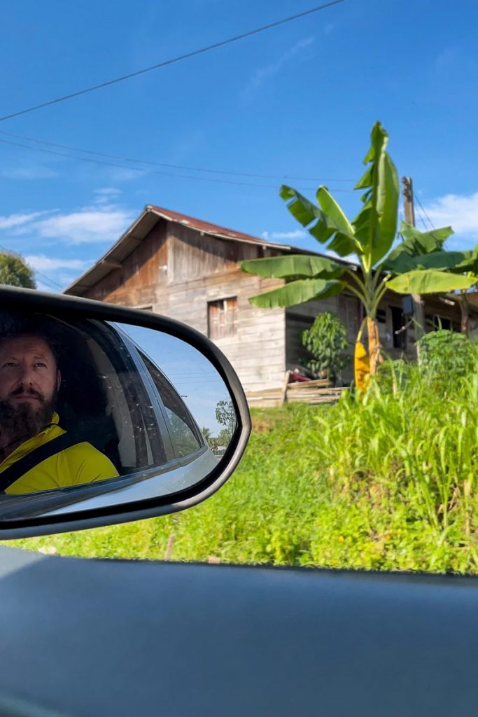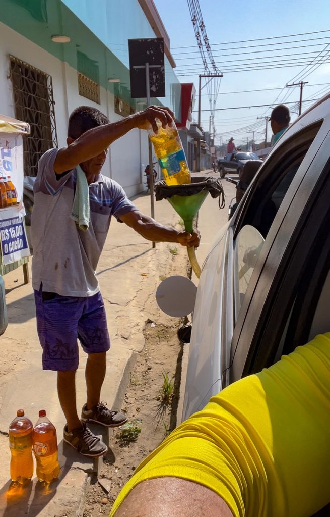 Schließlich bogen wir auf die einzige existierende Landstraße ab, die uns aus dem Ort heraus in kaum besiedeltes Dschungel-Territorium lenkte. Der Sprit war knapp und mit einer Tankstelle war auf der Strecke, die vor uns lag, nicht zu rechnen. Der Fahrer stoppte bei einem am Ortsausgang stehenden Einheimischen. Er hielt mehrere Plastikflaschen voller Benzin bereit und wartete auf Kundschaft. Als simple Einmanntankstelle befüllte er das Taxi und wir machten uns wieder auf den Weg.