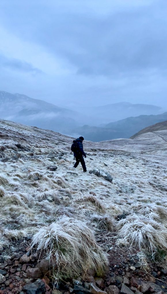 Der acht Kilometer lange Aufstieg begann um Punkt 8 Uhr am Glen Nevis Visitor Centre in Fort William. Noch dunkel, die Luft feucht aber regenfrei, liefen wir los.